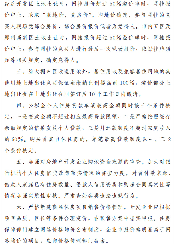 上述《通知》中的第二條明確:鄭東新區、鄭州經濟開發區土地出讓時,網掛報價超過50%溢價率時,網掛報價中止,采取 “限地價,競房價”,即地價確定,參與網掛的競買人現場競綜合房價,綜合房價報價低者為競得人。市內五區及鄭州高新區土地出讓時,網掛報價超過50%溢價率時,網掛報價中止,參與網掛的競買人進行最后一次現場報價,依據掛牌須知等相關規定,確定競得人。
