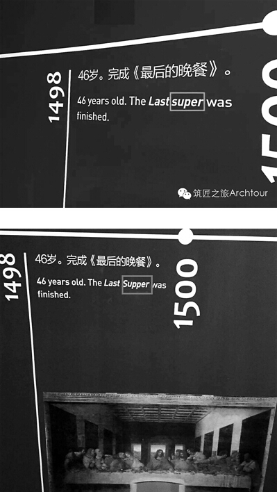 該網友發現,在這個介紹達·芬奇生平的年表上,英文錯誤不止一處:關于達·芬奇46歲的經歷,展覽介紹說:“46歲。完成《最后的晚餐》”,其對應的英文翻譯是“46 years old. The Last super was finished.”而super一詞在英文中的意思是“超級的”,“晚餐”的英文詞匯實為supper,該翻譯中少了一個字母“p”。