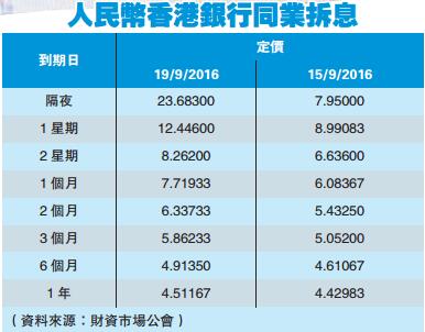 本港人民币资金池不断缩水。今年7月,港人民币存款规模较去年同期大减3258.19亿元或32.81%。不过,中银香港发展规划部高级经济研究员应坚指,实际资金供求并没有同业定盘价紧张。金管局日前则指,中秋长假期前,银行对拆出资金变得审慎是此轮人民币拆息上升的主因。市场预期,「十一」黄金周之后,本港人民币拆息将会回落至正常水平。