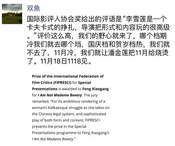 19日,馮小剛于朋友圈發文回應《我不是潘金蓮》撤檔一事,稱“國際影評人協會獎給出的評語是‘李雪蓮是一個卡夫卡式的掙扎,導演把形式和內容玩的很高級。’評價這么高,我們的野心就來了,哪個檔期冷我們就去哪個檔,國慶檔和賀歲檔熱,我們就不去了,11月冷,我們就讓潘金蓮把11月給燒燙了。11月18日1118見。”