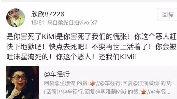 除了經紀公司,車徑行認為許多媒體也在事件中起到了非常不好的作用:“許多媒體為了抓熱點,博取眼球故意夸大,歪曲事實,給了公眾錯誤的引導;加上很多狂熱的粉絲以及不明真相的人,讓整個事態失控了。”