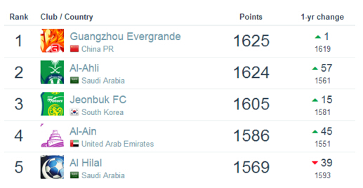 亞洲范圍內,廣州恒大重返亞洲第一,排名第二的是阿爾阿赫利,雙方僅相差1分。排名第3的是全北現代,如果亞冠成績出色,全北現代的排名有望繼續上升。第4和第5是阿爾艾因和阿爾希拉爾。