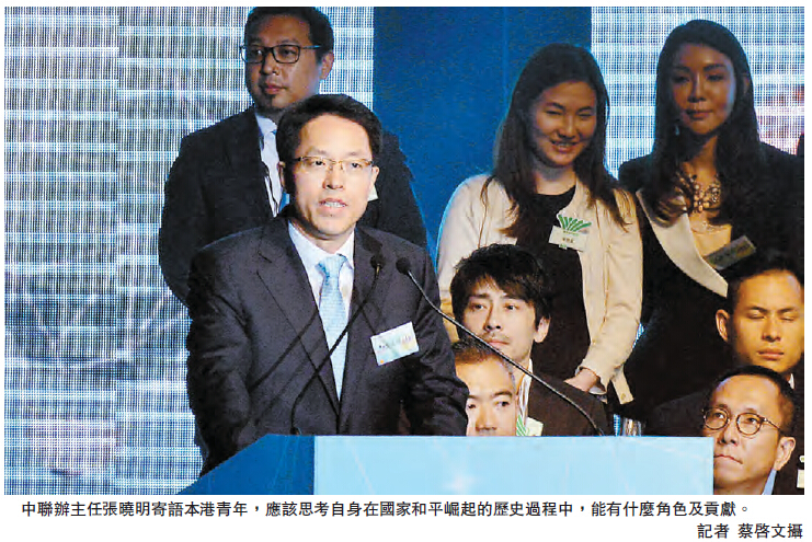 張曉明語重心長地寄語本港青年,應該思考一個問題:香港青年作為一個整體,在國家和平崛起、民族振興的歷史過程中,應該有什麼樣的角色和貢獻?他也希望青年思考,應該以什麼的視野、胸懷及擔當,在全球化的競爭環境中自立自強?而他期待並相信,香港青年一定會作出無愧於時代、國家及先輩的回答。