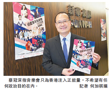 蔡冠深認為,有部分年輕人對國家的了解、認同未足夠,縱使大家對社會上不同的問題有怨氣,亦希望能在這一晚的音樂會上開心一下,放鬆心情。他續指,不希望在音樂上有任何政治目的在內,只為香港注入正能量。