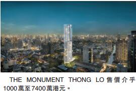 「THE MONUMENT THONG LO」位於號稱全曼谷最高尚住宅區通羅(Thong Lo),也是曼谷顯赫家族及富豪居住地區,媲美香港山頂和美國洛杉磯比華利山。該物業為46層高的永久業權住宅物業,佔地面積超過1英畝,提供127個單位,實用面積124.25至679.25平方米(1337.42至7311.39平方呎),折合港幣售價介乎1000萬至7400萬港元,平均呎價約7200港元。項目已於今年4月動工,預期2019年12月落成。發展商預期租賃回報每年平均達4%至5%。