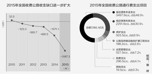 公報顯示,2015年全國收費公路收支平衡結果為-3187.3億元。與2010年至2014年相比,收支缺口又進一步擴大了。