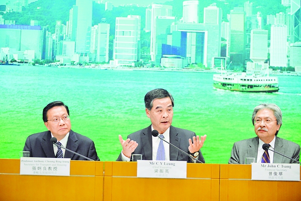 特區政府昨午舉行記者會解畫橫洲公屋發展計劃,左起:張炳良、梁振英、曾俊華。記者 蔡啟文攝