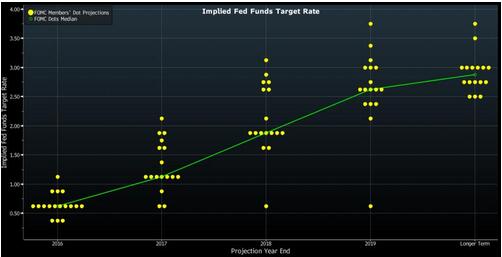 央行用于暗示未来利率路径的所谓“点阵图”表明,官员们预计今年加息一次,幅度为25个基点。三位决策者预计今年维持利率不变将是最合适之举。此外,决策者们还缩减了对2017年以及更长期的加息预期。