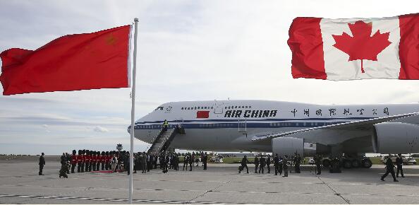 加拿大政府高级官员到机场迎接。礼兵沿红地毯两侧列队。中国驻加拿大大使罗照辉也到机场迎接。