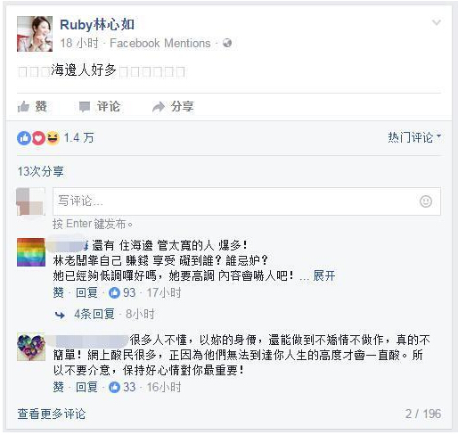 只是網友卻對林心如手拿酒杯提出質疑,紛紛表示“孕婦不是不該喝酒?”、“喝酒對寶寶不好”意外在網上掀起熱議。當事人林心如今在臉書發文,寫下“海邊人好多”疑似反擊正義魔人,粉絲也隨之附和,指責“管太寬的人太多”,更有人認為林心如行事已經很低調,偶爾放松不該被放大檢視。