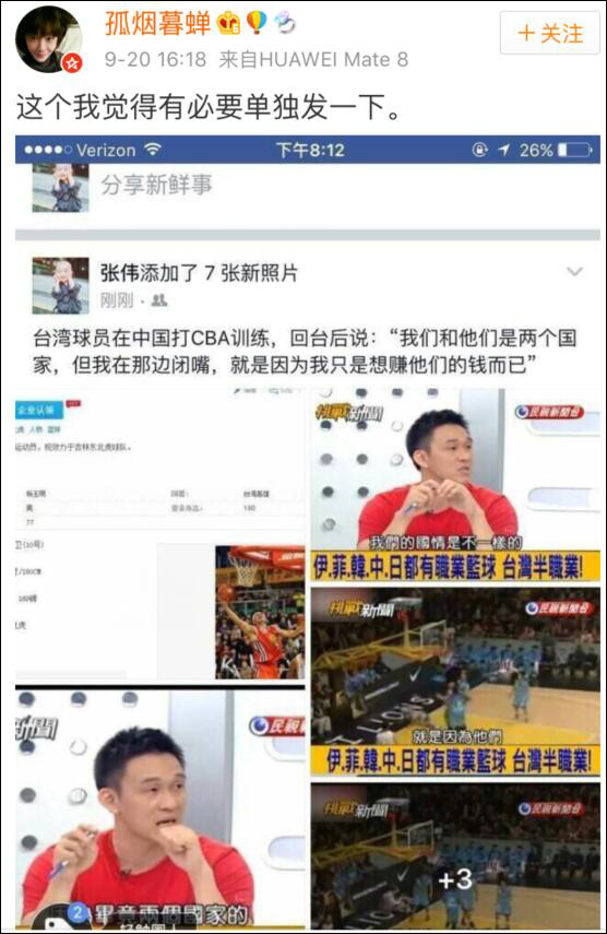 據網友@孤煙暮蟬9月21日爆料,CBA吉林隊前臺籍隊員楊玉明,曾在臺灣島內一檔電視節目中公開聲稱,兩岸是“兩個國家”,并表示在大陸打球“只是想賺他們的錢而已”,引發網友熱議。