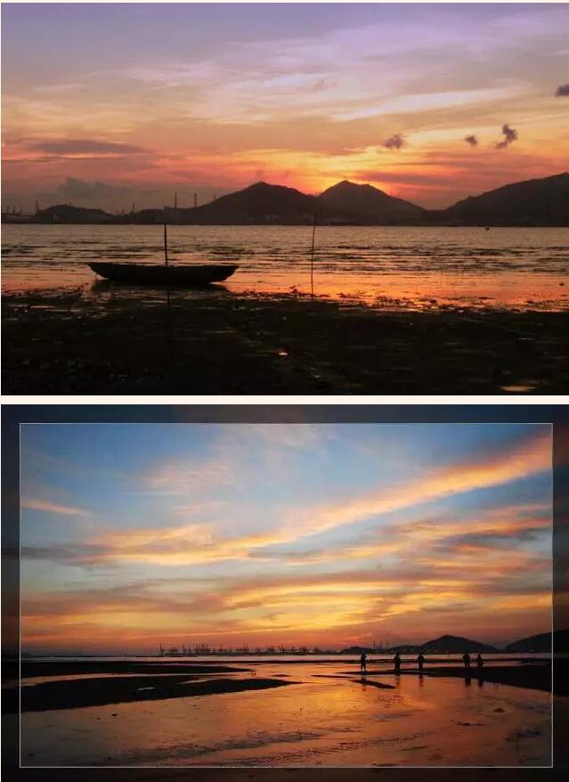 下白泥的独特美景,远处是日落深圳蛇口港。