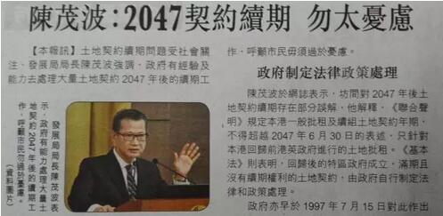 对于有提议要求政府立即处理所有2047年到期的地契续期,陈茂波认为不切实际,因提早30年续约有违契约定下期限的意义,即使未来将有大量土地契约于2047年到期,在有现行政策及先例可援的情况下,特区政府也绝对有经验、有能力在适当时候处理相关的续期工作。