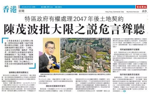 针对香港社会近日盛传“2047年后将自动失去业权”之说,陈茂波昨日发表网志严正澄清,“大限”之说完全没有理据。他批评一些论者甚至候任立法会议员,在毫无事实根据情况下“危言耸听”,臆测特区政府日后会根本地大幅改变现有政策,实在“莫名其妙”。