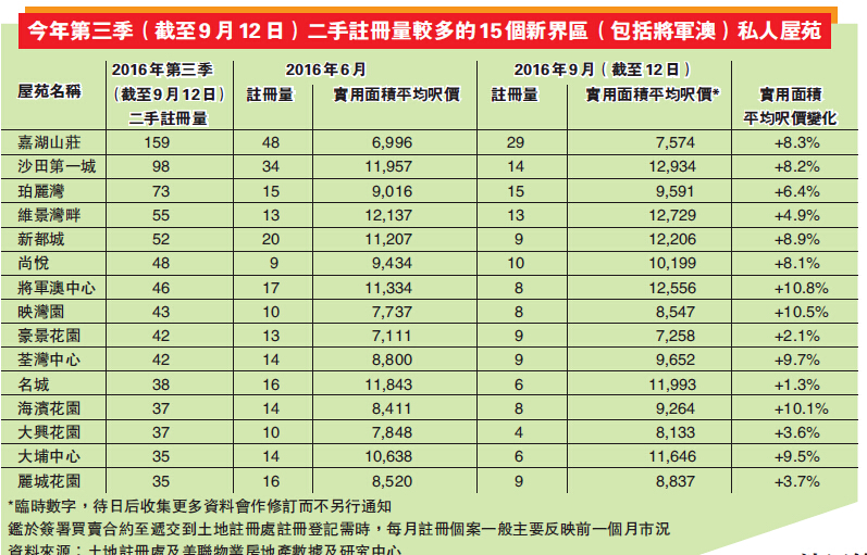 事實上,第三季二手註冊量較多的15個新界私樓中,成交呎價較6月升超過10%的屋苑不少,「將軍澳中心」升10.8%達12556元,緊隨其後的東涌「映灣園」及荃灣「海濱花園」,則分別升10.5%及10.1%。而升幅最少的為沙田「名城」,該私樓9月(截至12日,下同)暫錄升1.3%。