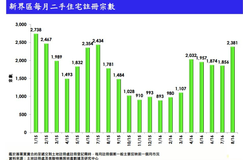 鑑於簽署買賣合約至遞交到土地註冊處註冊登記需時,每月註冊個案一般主要反映前一個月市況,即是8月一手及二手註冊量是反映7月份新界一手及二手成交顯著按月上升。