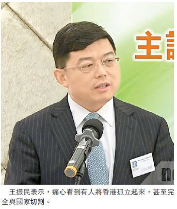 對於本港近年有人鼓吹「港獨」,王振民直言對此感到痛心,指香港的繁榮穩定很大程度是因為祖國,今天香港的衰落有人認為也是因為祖國的發展發達,於是有人就想躲避祖國,試圖把香港的門關起來,把香港孤立起來,有些人甚至不惜採取極端手段破壞香港。他指出,香港不屬於幾個人,而是屬於700萬香港同胞,屬於全國人民,香港與內地是統一體,折騰香港這個局部,就是折騰整個國家,當香港「感冒」、「生病」,要吃藥的是整個國家;但他同時指出,如果香港亂了,對於國家的損失可能是萬分之一,但對於香港就是百分之百,是大家都無法承受的災難。