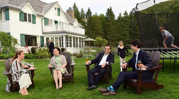 当地时间21日傍晚,李克强总理抵达加拿大两小时后,就在渥太华的哈灵顿湖总理官邸出席加拿大总理特鲁多夫妇举行的家宴。餐前,两国总理夫妇在官邸门外的湖边小坐交谈。一顿三道菜的简单晚餐后,两国总理夫妇返回湖边,欣赏晚霞景色并继续交流。