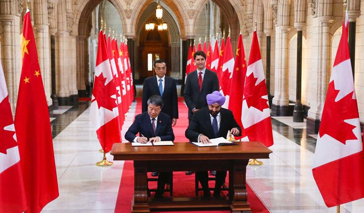 国务院总理李克强和加拿大总理特鲁多22日上午在加国会大厦共同出席了两国合作文件签字仪式。在两国总理的见证下,两国代表签署了中加“关于开展第三方市场合作的联合声明”等14份合作协议,覆盖贸易、投资、金融、旅游、教育、司法合作等诸多领域。