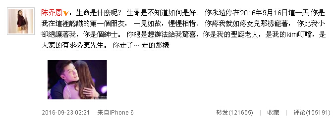 23日凌晨,陳喬恩在微博曬出一張與喬任梁擁抱的合影,并發表長文悼念好友喬任梁,在惋惜他離世也更多的自責沒能好好關心朋友。隨后,網友都紛紛表示:“看到你這樣好心痛,好好的吧,讓他安心的走”。