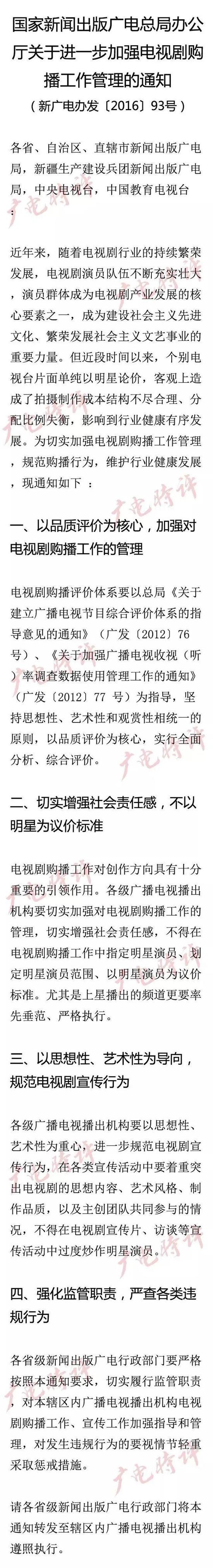 廣電總局的這份《通知》進一步加強電視劇購播工作管理,明確了電視劇購播的評價體系要以品質評價為核心,實行全面分析、綜合評價。在電視劇的宣傳方面,《通知》也要求,要著重突出電視劇的思想內容、藝術風格、制作品質,以及主創團隊共同參與的情況,不得在電視劇宣傳片、訪談等宣傳活動中過度炒作明星演員。
