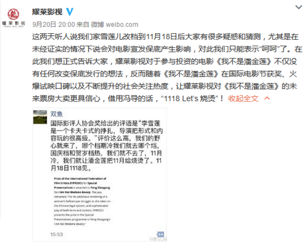 其次,《我不是潘金蓮》“之前已經調整完畢,不會再有調整。對于馮導來說,他始終堅持把一個更好的電影故事帶給大家,沒有什么比一個精彩的、不會讓觀眾失望和遺憾的作品更重要。”