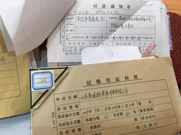发布台上整齐摆放了两排共36本厚厚的公司记账凭证,主席台两侧还各放置了十面展板,展示其捐款凭证及荣誉证书扫描件。记者翻看记账凭证发现,最後一本编号「36」的记账凭证封面显示数据为2009年的,而这本之前的几本封面则显示数据为2013年的。记者翻开最後一本记账凭证,看到其中有一张2009年11月27日向南京市慈善总会捐赠、用於救助南京下关区重病儿童的5000元付款通知单。记者欲继续翻看,被现场工作人员制止,并表示发布会上会一本一本翻给记者看。但直到发布会结束,也未见这些记账凭证被展示出来,会後这些凭证就被全部收走。