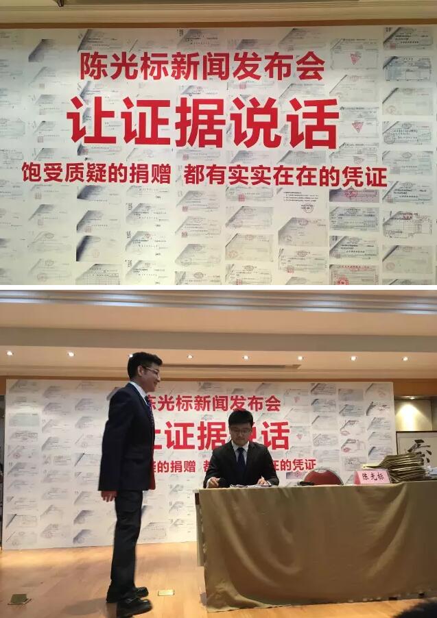 发布会中,陈光标表示,自己的捐款99%都落实了,现场都有捐款凭证、收据及荣誉证书为证,且自己是带着其他企业家一道去捐款,在自己的经营地从不捐款,捐款地从不做经营,自己个人卡上也从未收到任何捐款。主持人称,以公司名义捐献只是陈光标从事慈善事业的一部分,这一点,社会是公认的。并指财新报道有38处模糊不清的采访信源,涉嫌肆意捏造新闻,大失专业水准。
