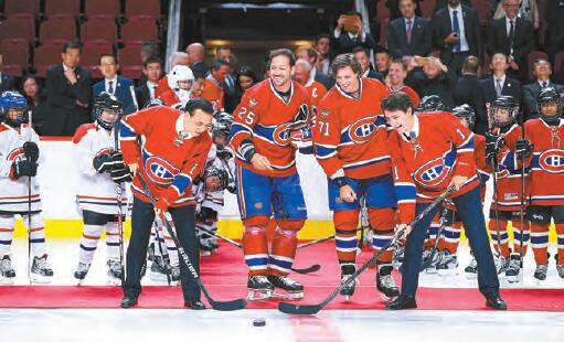 李克强和特鲁多为蒙特利尔「加拿大人」冰球队开球。 中新社
