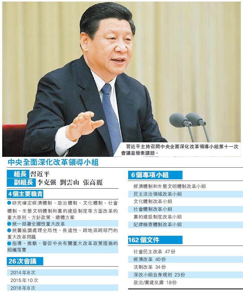 【香港商报网讯】2013年12月30日,中共中央政治局召开会议,决定成立由习近平总书记担任组长的中央全面深化改革领导小组。该小组负责改革的「总体设计、统筹协调、整体推进、督促落实」。到昨日为止,深改组成立已经第1000天,这期间,中央深改组共召开了27次会议,审议了162份文件。