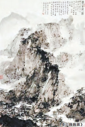 傅抱石避亂東川時,因藝事與「院西」相識,而后交情益篤,曾以《松菊思歸》、《山水人物冊》等佳作相贈,并曾為之制印,當見二人莫逆。丙戌冬,「院西」泰山泰水「醒農」、「桂玉」二老雙逢花甲喜壽,為慶好事,才有前述索畫之請。是故,尽管傅抱石初返南京,忙於應對諸事種種,但甫接老友為賀長輩壽誕索畫之請,亦不敢不精意忱悃,用心用意寫成此幅《泰山巍巍圖》。