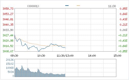 周一開盤兩市低開低走,滬指再度考驗3000點支撐,兩市近2000股下挫。截至午間收盤,滬指報3012.34點,跌幅0.71%;深指10532.6報點,跌幅0.73%.