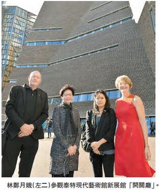 其後,林郑月娥参观了泰特现代艺术馆的新展馆「开关厅」,新展馆是楼高10层呈扭曲三角锥体形状的塔楼建筑,由香港西九龙文化区M+博物馆的设计者Herzog&deMeuron建筑师设计,是全世界最大规模的国际现代及当代艺术馆之一。林郑月娥以西九文化区管理局董事局主席的身份为泰特现代艺术馆与M+博物馆寻求合作空间。