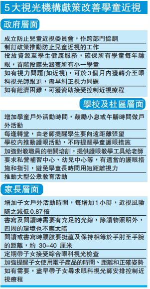 10月13日为世界视觉日,今年的主题是「团结一起(StrongerTogether)」,本港5大视光机构:护眼基金、香港理工大学眼科视光学院、香港执业眼科视光师协会、香港眼科视光师学会及香港隐形眼镜学会昨日在举行联合记者会上,他们亦提出系列建议,在政府、学校及家长层面上吁请社会各界同心协力改善学童近视问题(见附表)。