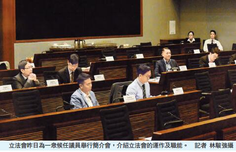立法会陆续为候任立法会议员作工作准备,特别是26位「新丁议员」,举办了一系列「迎新活动」。昨日就分别於上午及下午举行两场简介会,昨上午先由立法会秘书长陈维安联同法律顾问等人,向候任议员介绍立法会、议员的权力及职能,也讲解相关条例;下午则由即将退下火线的两位资深立法会议员主持,包括民建联叶国谦及民主党刘慧卿,他们分别向议员分享多年的议会经验。