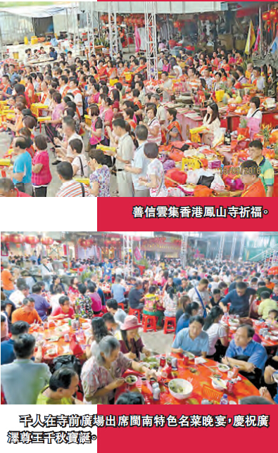 【香港商報网訊】記者鄭玉君報道:位於屯門小坑村的香港鳳山寺,供奉福建神靈「廣澤尊王」,周前舉行千秋寶誕暨千人宴,期間同時舉行香港鳳山寺有限公司董事局成立典禮,冀日後更大力推廣尊崇孝道的鳳山文化,廣做慈善事業。