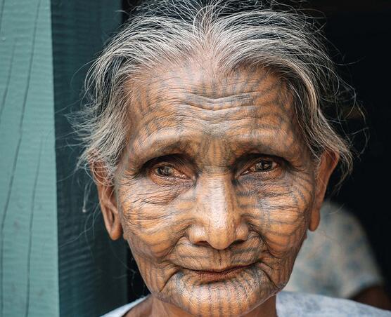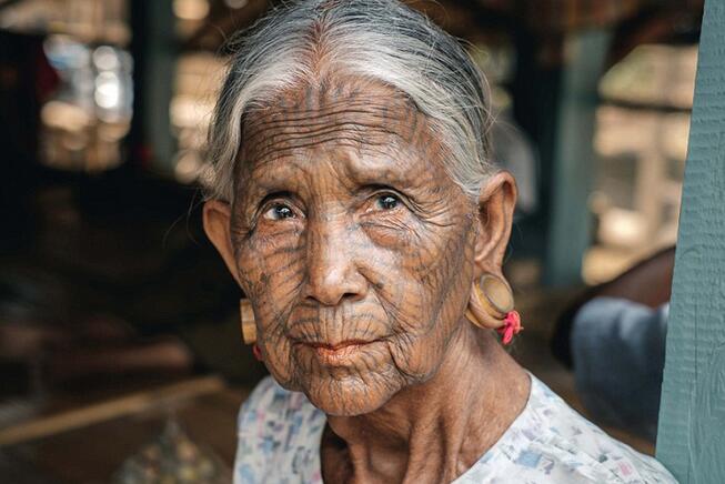 与西方年轻人爱好极端纹身来修饰身体不同,在缅甸,只有上了年纪的女子才拥有她们标志性的面部纹身。在这里,纹身是成人的标志。一个女孩年龄达到12-14岁后,就被认为可以纹身了。