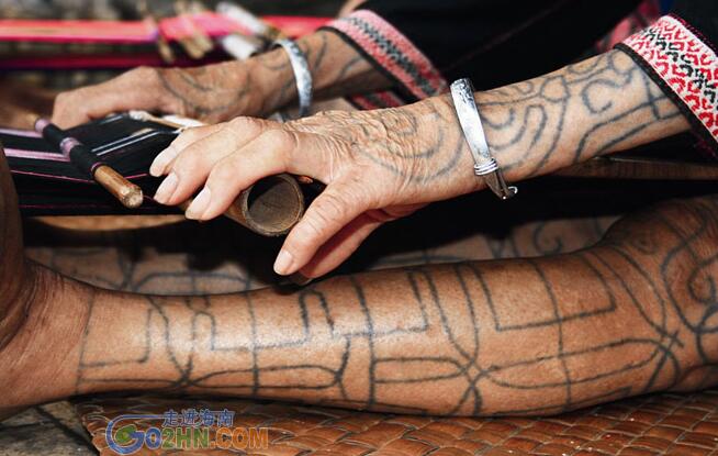 黎族的是海南最早的居民,其历史可追溯到新石器时代,至今已有数千年。黎族的纹面京身是黎族人主要的标记,据说黎族先人崇拜蛇图腾,他们喜欢在自己身上纹上与蛇虫一样的图案,而且黎族女子的纹面也体现了贫贱富贵的等级关系,纹面是有身份妇女的一种装饰。黎族文身被人类学者誉为“人体上的敦煌壁画”,见过黎族纹身文化的人会经久难忘:黑色的线条在脸上纵横,下巴上也密密地布着几道,像是用炭划过一般,有些则像是被密密麻麻的大头针扎过,遍及四肢。按照黎族老人的说法,女孩子要是不“打登”(黎语,指纹身),死后是无法到祖宗那儿报到的。在我们看来差别不大的纹身,对于黎族人来说有着特殊含义,这跟他们的服饰一样,是区别于其他支系和部落的重要标志。