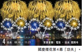 此外,国庆烟花汇演将於晚上9时在维多利亚港举行,历时约23分钟,市民可在维港两岸欣赏烟花汇演。是次烟花汇演由海南省港区政协委员联谊会赞助,由3艘趸船发放23888枚烟花弹,共分8幕,最具特色的分别是第4幕的「功夫」,烟花呈现犹如劲风,快如闪电的功夫招式。第7幕「海之歌」则有特别设计的水母和浮游生物图案。最後一幕「黄河下游」绚烂热闹,加上密集发放缤纷色彩的烟花,把整个烟花汇演推向高潮。