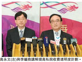 高永文昨午与香港私家医院会代表会面,讨论提高私家医院收费透明先导计划。他在会后表示,在先导计划下,医院为病人进行24种常见非紧急手术或程序前,会列明手术费、麻醉费等,以及因应不同等级病房、不同用药或额外检查等产生的额外收费,作收费预算供病人参考。私家医院同时会网上公布医院各项收费,以及不同病人接受各项手术的收费,供病人参考。