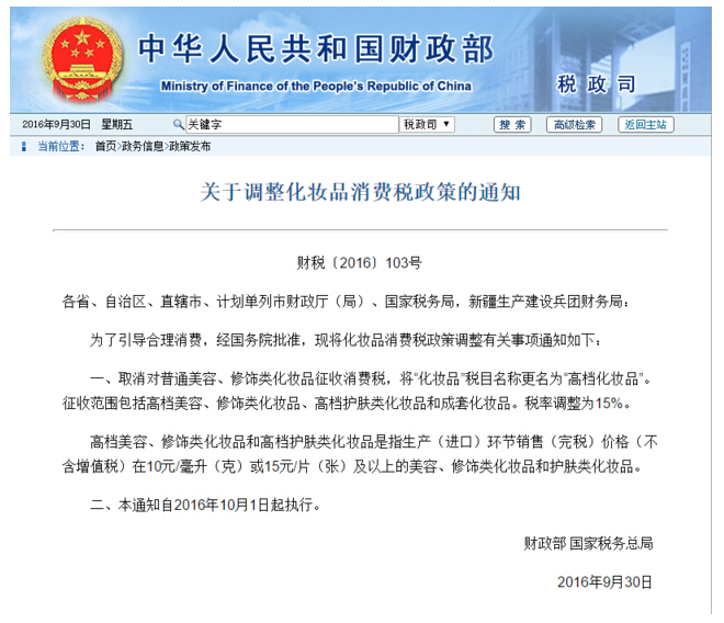 9月30日,財政部發布公告稱,自2016年10月1日起,取消對普通美容、修飾類化妝品征收消費稅;高檔美容、修飾類化妝品、高檔護膚類化妝品和成套化妝品稅率由原先的30%調整為15%。