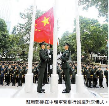 1997年7月1日零時零分零秒,駐港部隊3名旗手在中環軍營第一次將鮮豔的五星紅旗升起,標誌香港150多年屈辱歷史的徹底終結,也標誌著中國人民解放軍駐香港部隊正式擔負起香港特別行政區的防務。從那一天起,除非暴雨等惡劣天氣,駐軍各營區每天都按時升降國旗,每逢「七一」「十一」都要隆重舉行升國旗儀式。