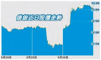 【香港商報網訊】法新社在Twitter上援引未具名知情人士稱,德銀接近與美國政府就抵押貸款支持證券(RMBS)調查達成接近54億美元(約421.2億港元)的和解協議,遠低於此前140億美元。受此消息刺激,德銀當地時間9月30日出現「報復性」反彈,在紐約上市交易的股價比前一交易日急升14.12%,收報每股13.09美元。德銀在德國的股價也升超過8%,突破11歐元關口。