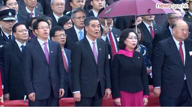 儘管香港天文臺在昨日清晨5時55分發佈了紅色暴雨警告,一年一度的國慶升旗儀式仍如期舉行,體現了香港特區對國慶日的重視。8時許,香港員警銀樂隊即將奏起國歌之際,中聯辦主任張曉明就主動放下自己手中的傘,在雨中肅立並向國旗行注目禮,行政長官梁振英見狀立即示意他身邊的夫人梁唐青儀收起雨傘,梁太亦立即跟隨。站在張曉明附近的嘉賓亦紛紛收起傘冒雨觀禮。