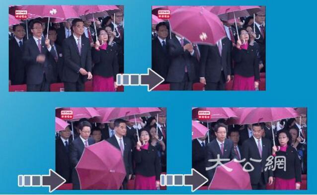 中聯辦主任張曉明主動放下自己手中的傘,在雨中肅立並向國旗行注目禮。 圖:香港電臺