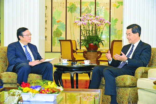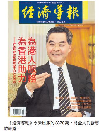 採訪一開始,梁振英就說,我與《經濟導報》是老朋友,經常看《經濟導報》,以往也曾接受《經濟導報》採訪,更為《經濟導報》寫過文章。他盛讚《經濟導報》很有歷史,對經濟、社會及民生問題的分析與報道水平很高。
