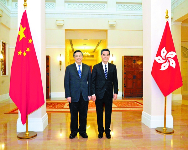 9月7日下午,行政長官梁振英接受《經濟導報》社長陳寅採訪。圖為梁振英與陳寅在禮賓府合影留念。