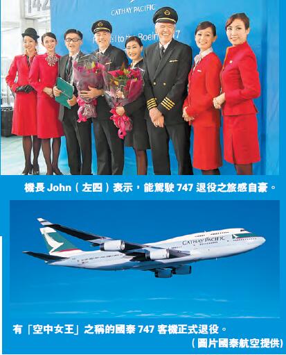 有「空中女王」之稱的國泰航空波音747客機,為國泰服務超過37年,完成於9月30日由香港出發至東京羽田機場的CX542航班、10月1日由東京羽田機場回香港的CX543航班后便正式退役。負責這次退役旅程的飛機是「B-HUJ」、又名「Polar 1」,因她是首架飛越北極上空的客機,而且她更是首架在赤濸角新香港國際機場降落的飛機。