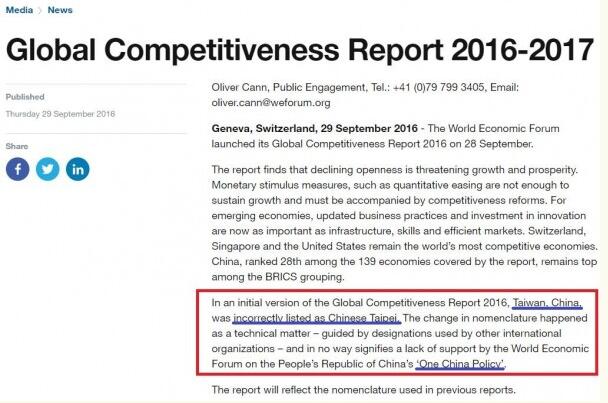 《2016-2017全球競爭力報告》中,使用的是“中華臺北”(Chinese Taipei)的名稱