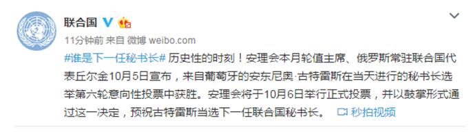 联合国:历史性的时刻!安理会本月轮值主席、俄罗斯常驻联合国代表丘尔金10月5日宣布,来自葡萄牙的安东尼奥·古特雷斯在当天进行的秘书长选举第六轮意向性投票中获胜。安理会将于10月6日举行正式投票,并以鼓掌形式通过这一决定,预祝古特雷斯当选下一任联合国秘书长。